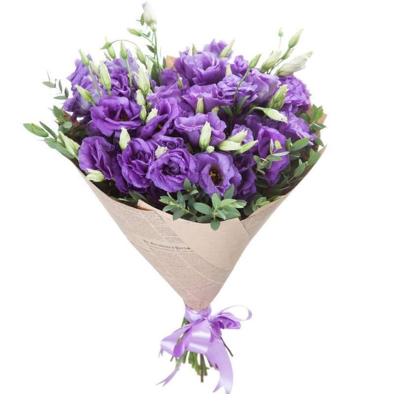 Букет состоит из 19 веток сиреневой эустомы, зелень, крафт, атласная лента.