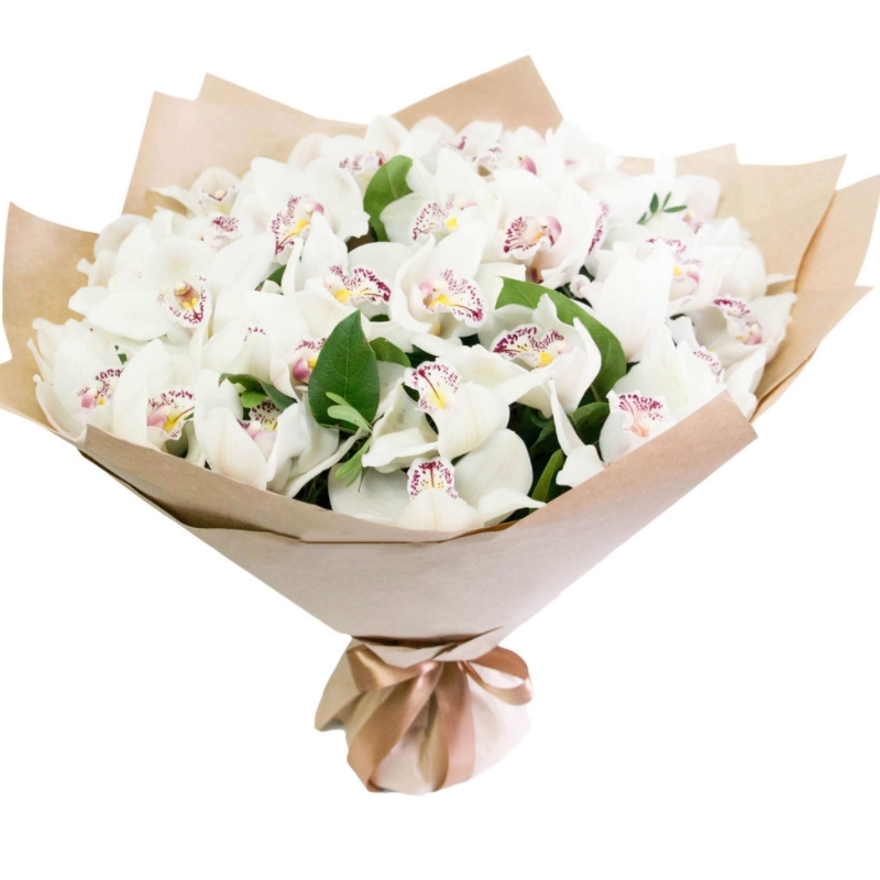 Букет состоит из 31 орхидея, зелень, крафт, атласная лента.