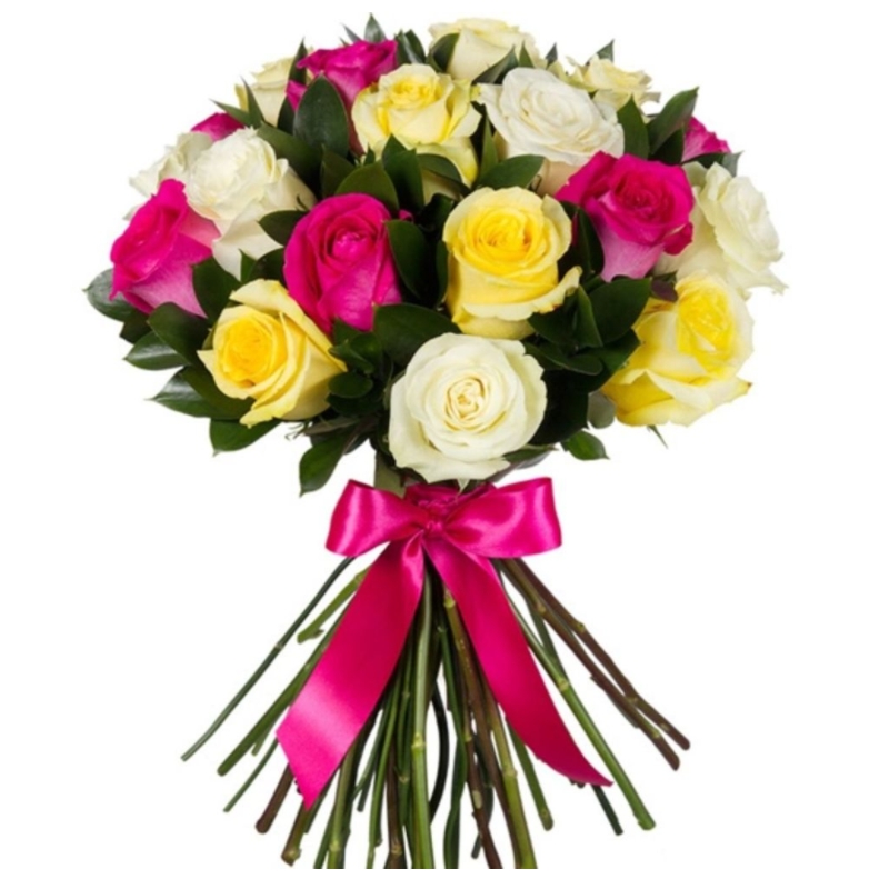 Букет состоит из MIX из 19 роз, прозрачная упаковка, атласная лента.