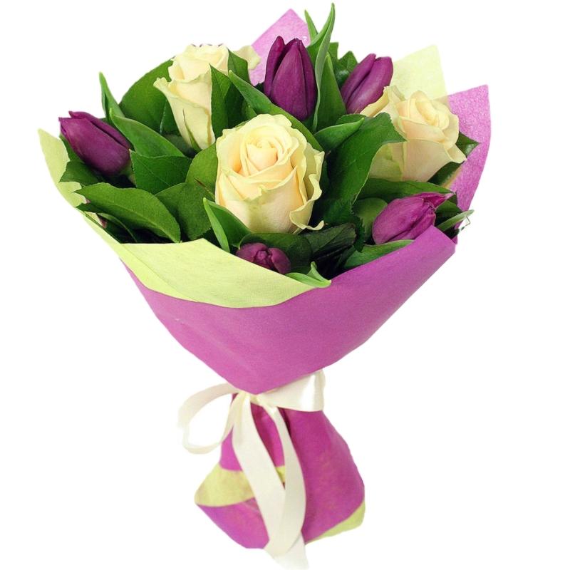 Букет состоит из 6 сиреневых тюльпанов, 3 белые розы, салал, красивая упаковка, атласная лента.