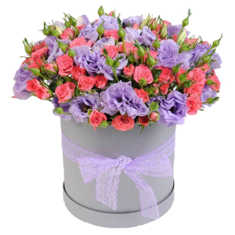 Букет состоит из 8 веток розовых кустовых роз, 7 веток эустомы, коробка, оазис.